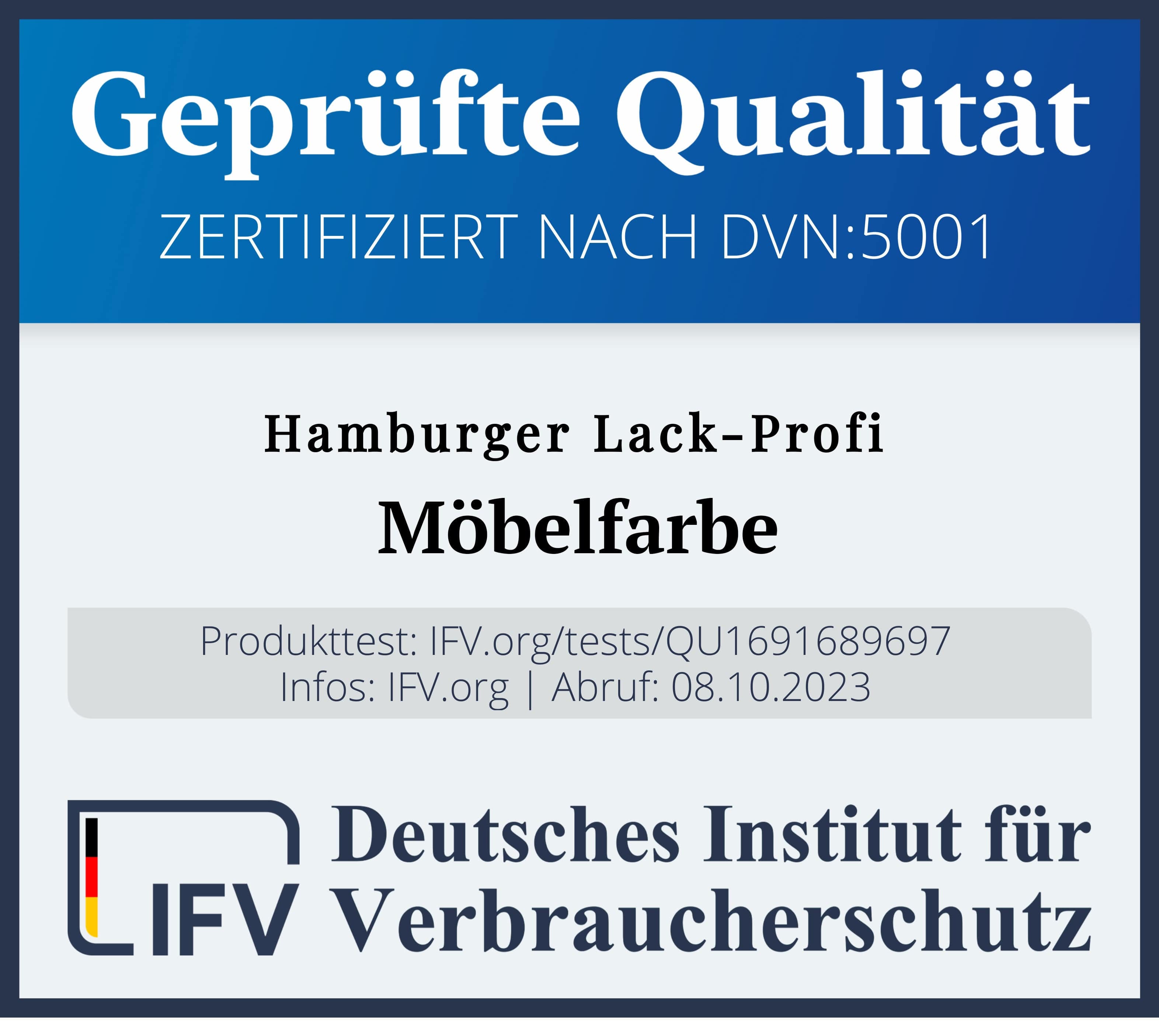 Unsere Möbelfarbe hat die anspruchsvollen Tests des IFV (Deutsches Institut für Verbraucherschutz) durchlaufen und dabei die höchsten Standards erreicht. Wählen mit Vertrauen, wähle geprüfte Qualität!